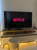 The apartment is composed of 1 bedroom, a fully equipped kitchen, and 1 bathroom. A flat-screen TV is featured.
